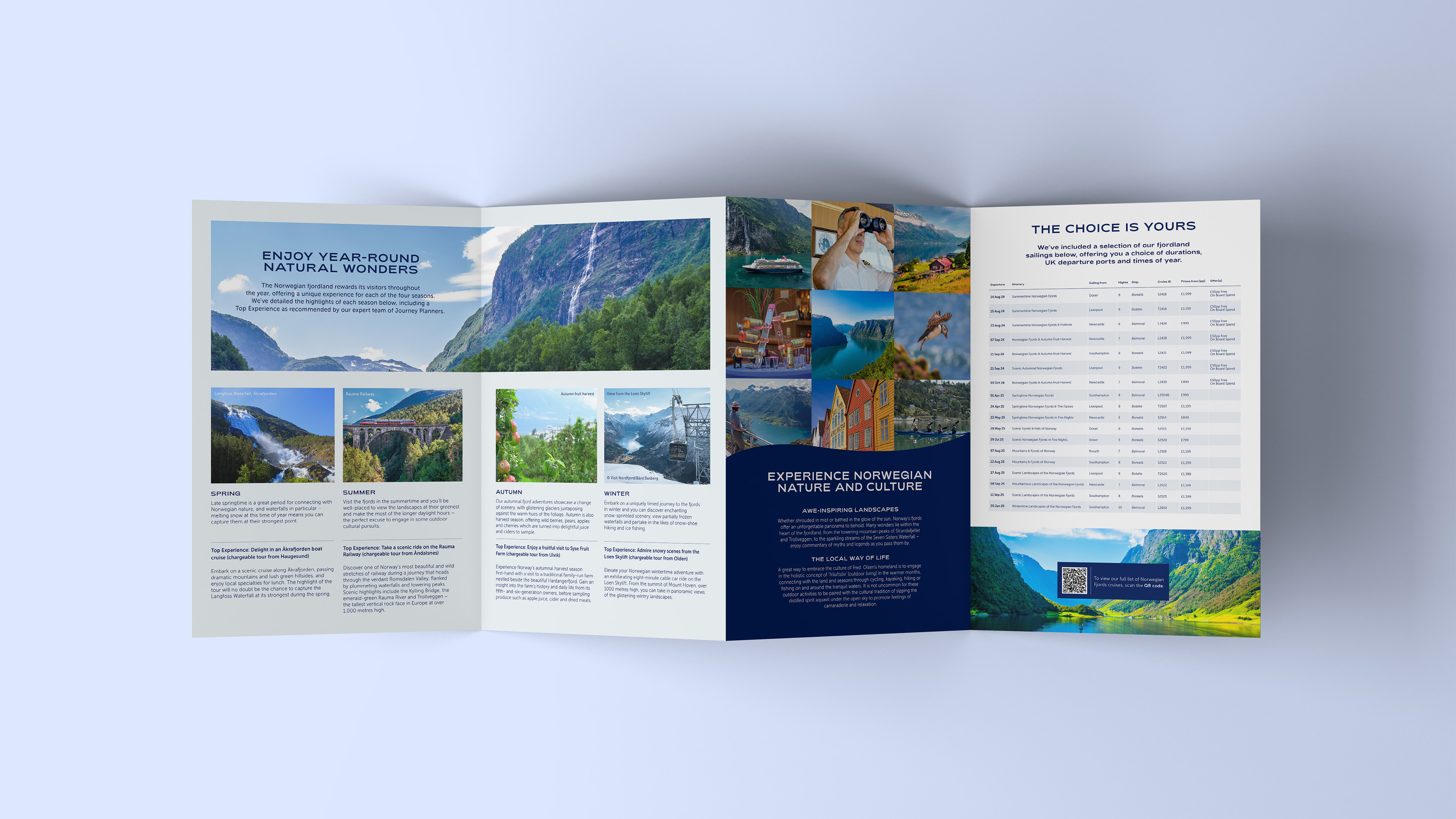 A brochure collection for Fred Olsen Cruise Lines. Crafted to inspire curiosity and confidence, each page guides readers through destinations, experiences and moments at sea, reflecting the brand's timeless charm and welcoming sense of adventure.